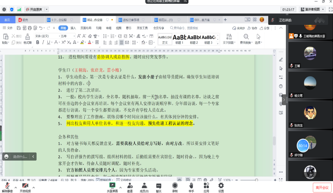 历史系主任王朝海结合师范认证专家进校线上考核的特殊性,就专家线上考核的要求和所需材料进行了详细汇报和解释。杨文笔副院长、杨浣副院长以及王朝海主任依据详细的工作清单,与全体参会教师一同讨论,部署了初步的分工方案。参会教师积极发言,为师范认证工作建言献策。杨文笔副院长要求会后所有老师应当迅速行动,结合线上考核要求查漏补缺,及时反馈困难和问题,努力冲刺好师范专业认证的最后阶段。