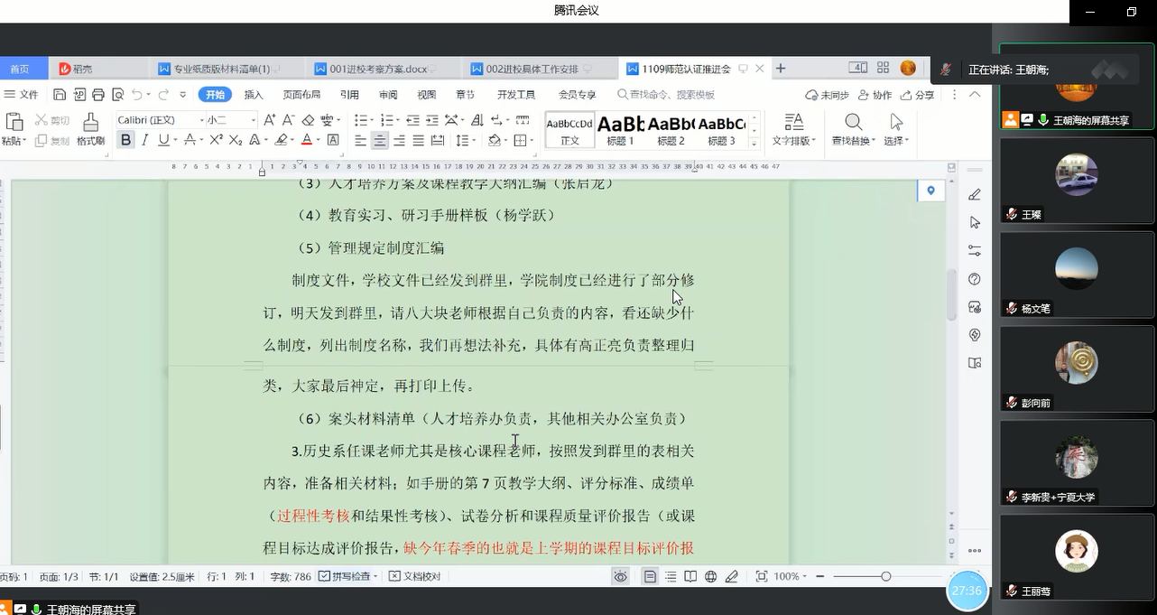 杨文笔副院长首先讲明了召开本次会议的目的,强调了此次工作的重要性。随后,他将此次师范认证专家进校情况再次做了全面的介绍,历史系系主任王朝海对于此次迎接专家进校认证工作方案和任务分工进行了详细部署说明,对近期重点工作进行了一个强调。随后承担前期主要工作任务的老师先后汇报了各自的工作进度,提出工作中存在的困难,大家对于如何解决这些问题进行了讨论。