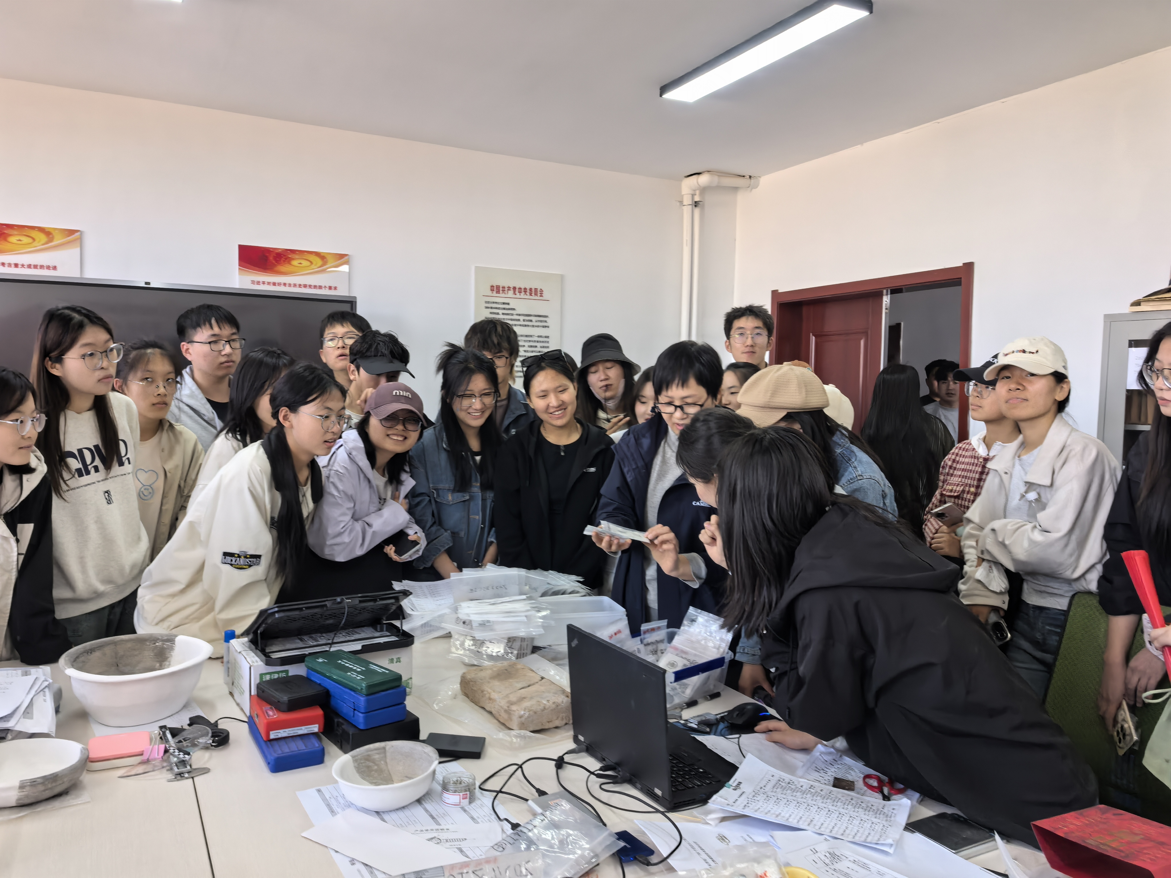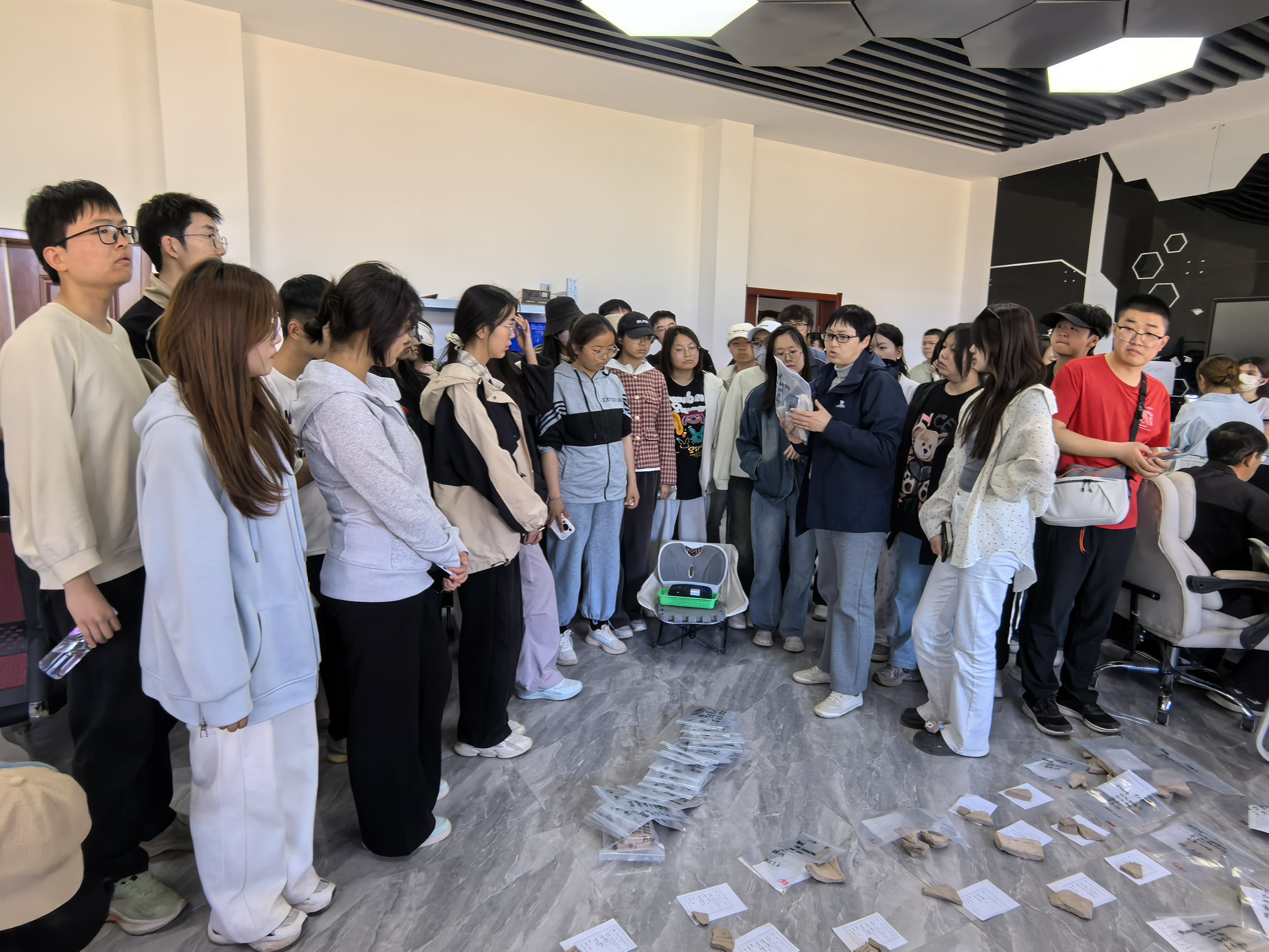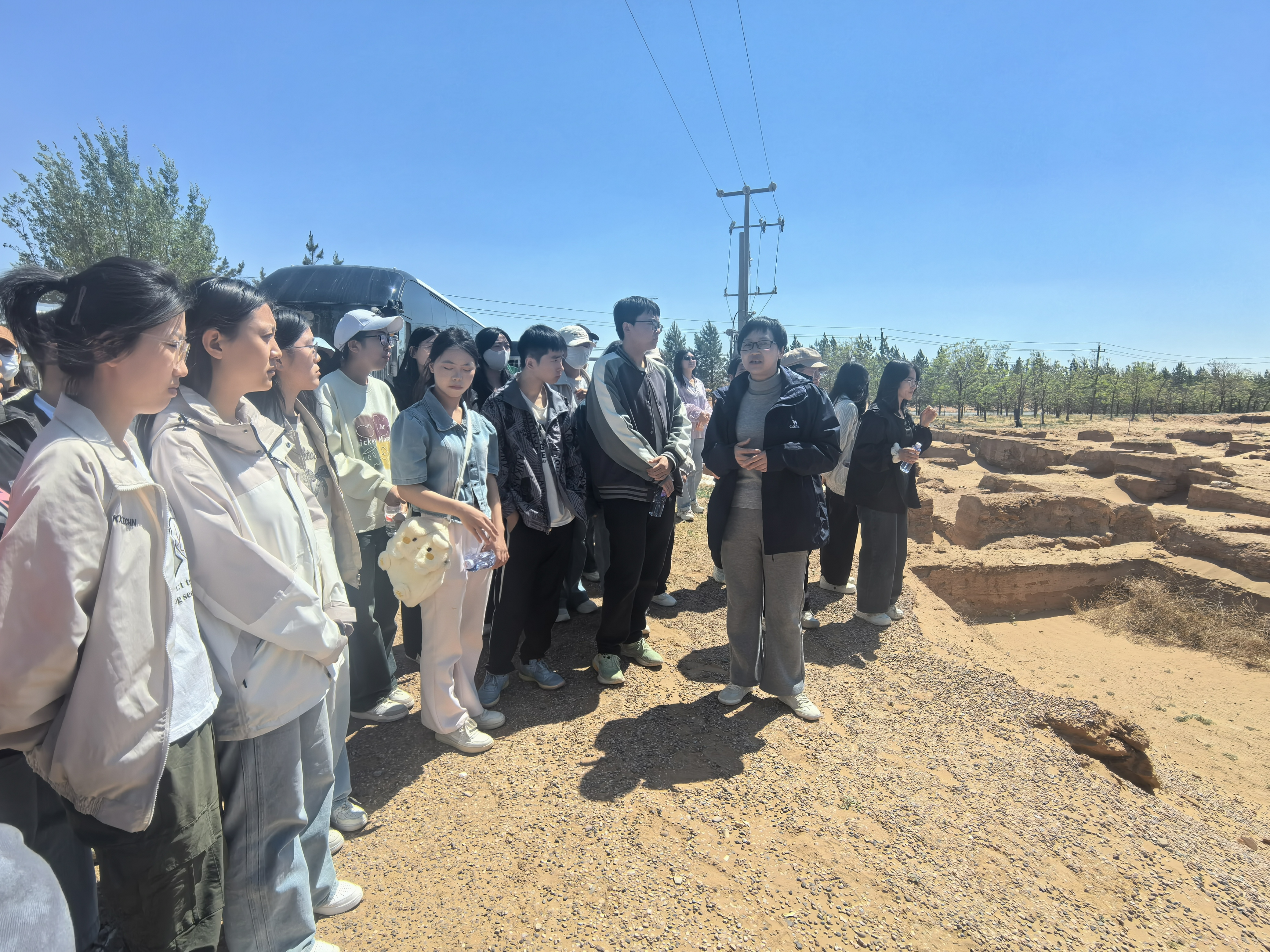 第三站是张家场古城考古发掘工地。张家场古城位于盐池县城西北17公里的花马池镇张家场村西,地处鄂尔多斯台地、毛乌素沙漠西南边缘,是宁夏乃至河套地区规模最大、保存较好且出土文物最为丰富的一处秦汉时期古城遗址。同学们在宁夏文物考古研究所盐池县考古工作站负责人马晓玲老师的带领和专业讲解下,近距离了解了考古工作者艰辛和重要价值,初步学习了田野考古发掘、室内考古、出土文物保护与修复、考古绘图、文物考古研究、展示利用等考古学的基本工作流程和科学方法,近距离触摸到现场出土的大量建筑构件、陶器、铜器、铁器以及汉代钱币等遗物,同学们对古代边疆城市考古、统一多民族国家的形成以及多民族文化交往交流交融有了更深入的认识与思考。