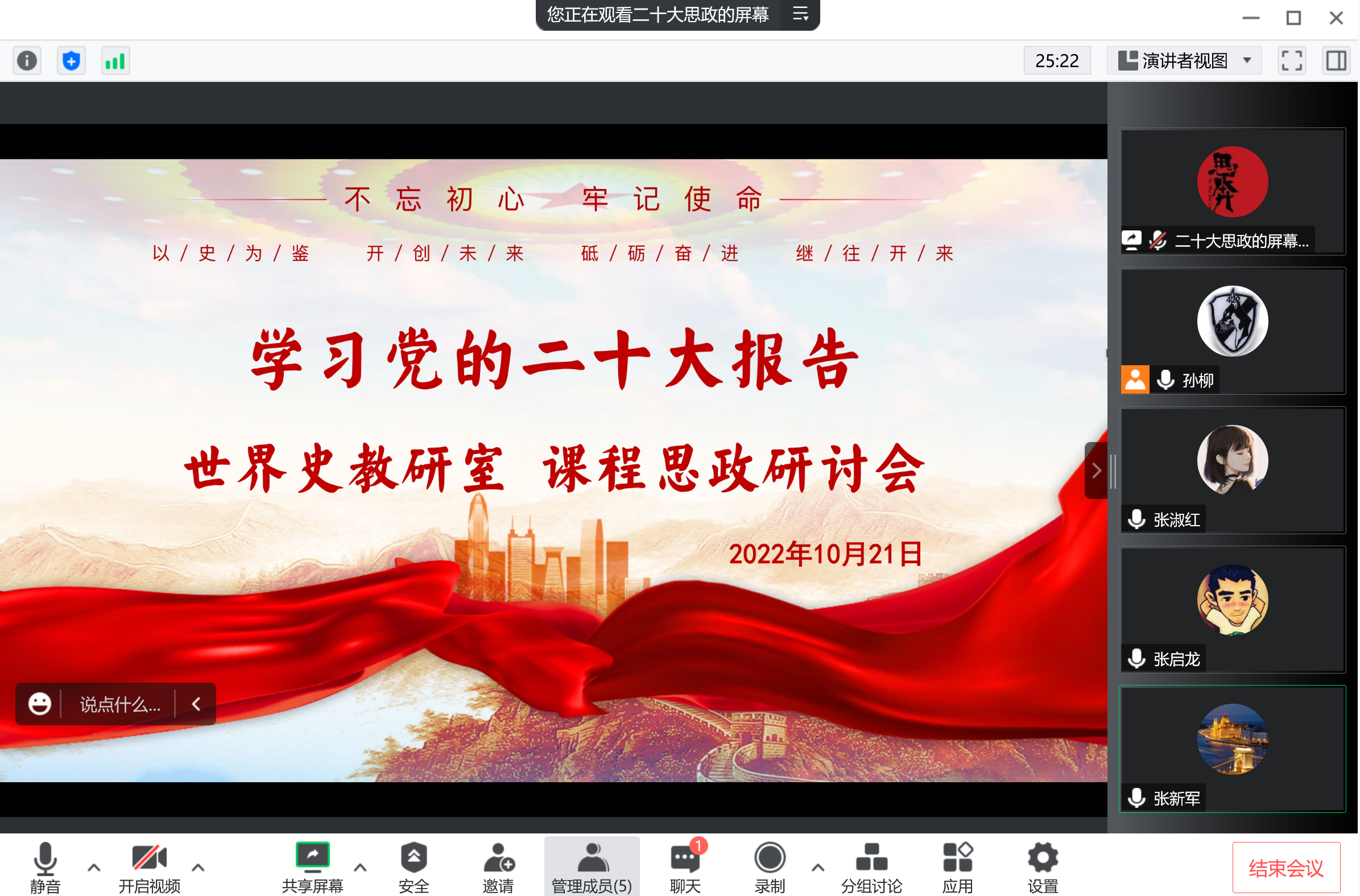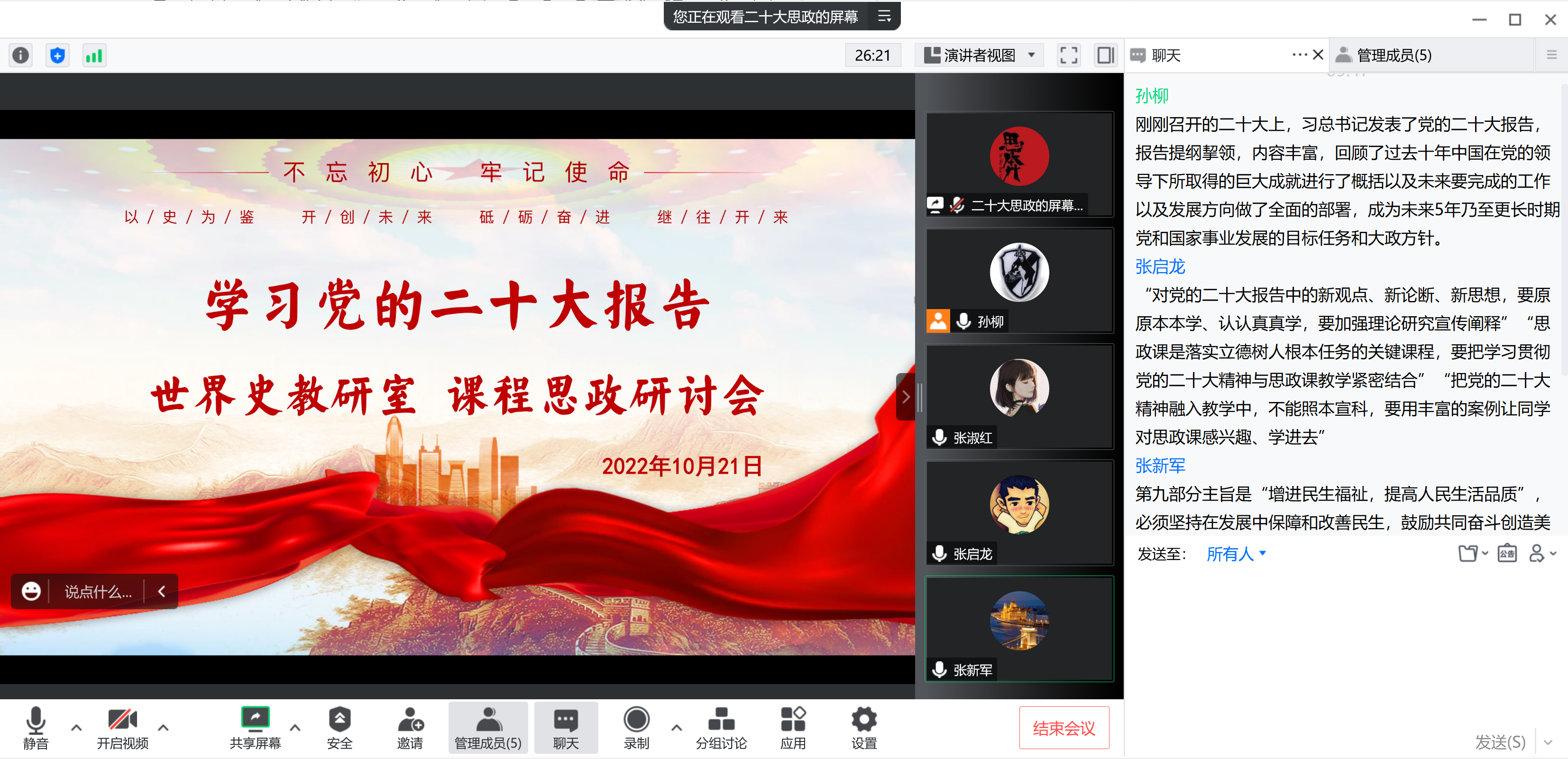 历史系世界史教研室于10月21日上午进行“党的二十大报告与世界史课程思政”专题研讨会,教研室教师就党的二十大报告内容、精髓与世界史课程思政之间的关系在腾讯会议进行了深入探讨。