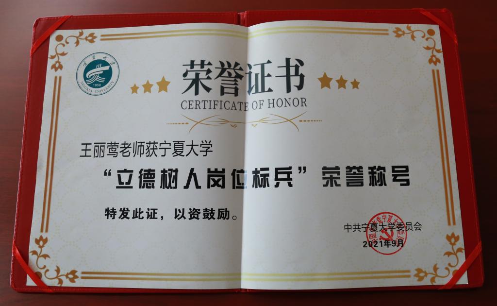 王丽莺老师荣获宁夏大学“立德树人岗位标兵” 荣誉。