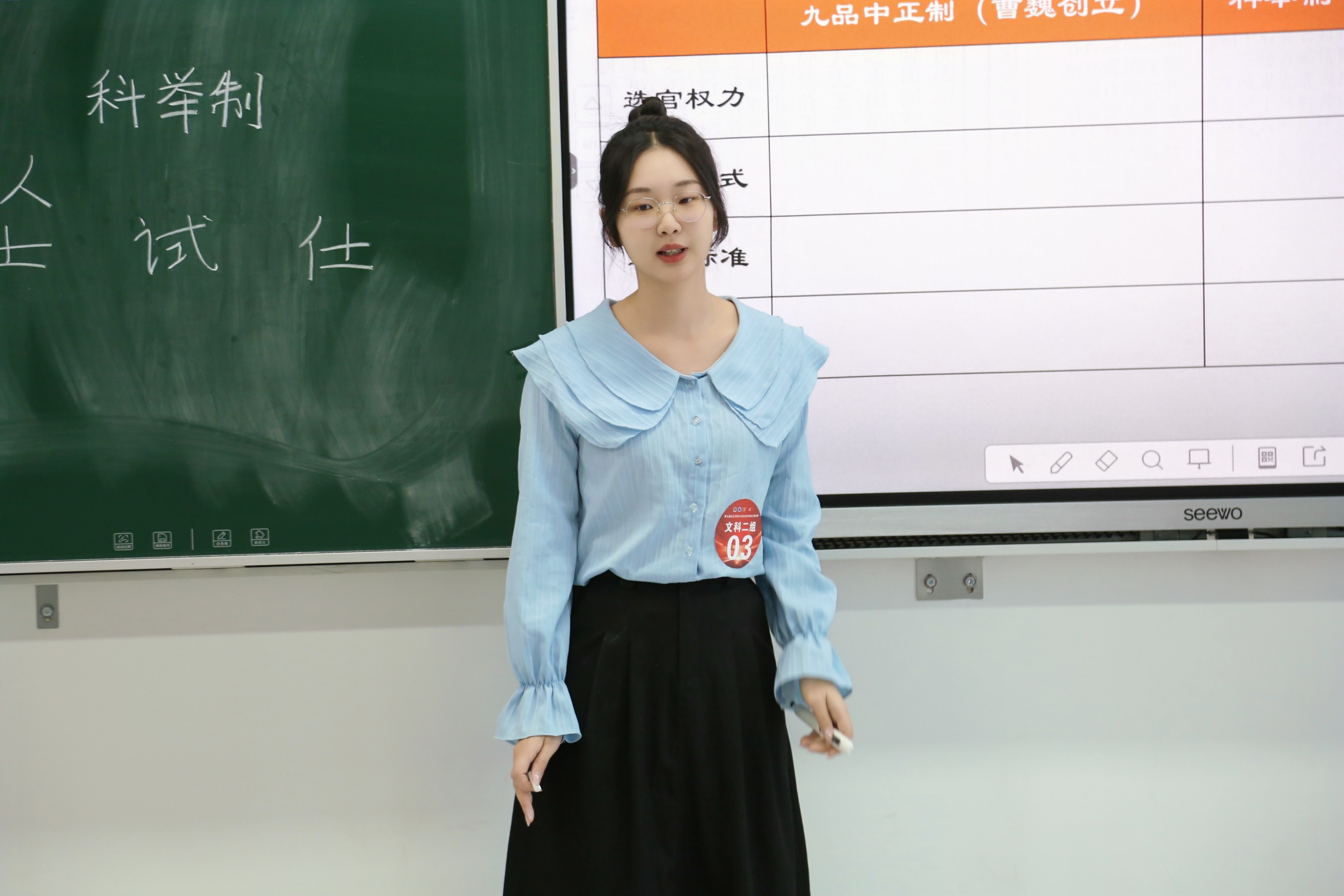 唐茂翼同学在比赛中展现了深厚的历史专业功底与出色的教学技能。她秉持“用教材教而非教教材”的理念,深度挖掘隋唐制度变革中的历史逻辑,重构教学内容。以清晰的主线串联制度创新与社会发展,通过互动提问、史料分析激发学生思维,课堂氛围生动且富有启发性,充分体现了新课标下的教学创新。课程思政方面:合理融入“制度创新推动国家发展”的价值导向,实现知识传授与价值引领的有机统一。