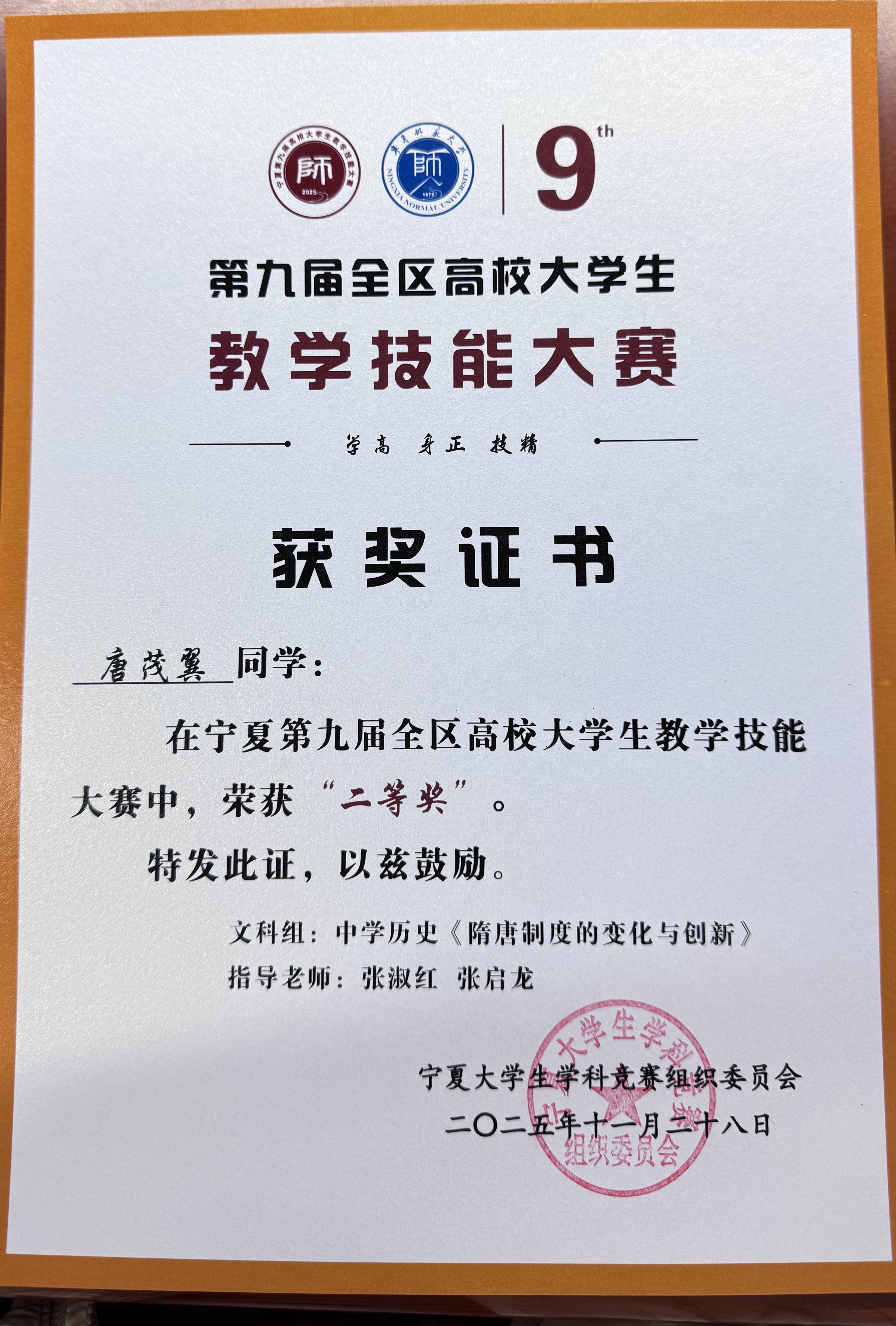 22级历史学(师范)专业本科生唐茂翼同学经过院赛、校赛的层层选拔,作为宁夏大学历史学科唯一晋级决赛的选手,凭借《隋唐制度的变化与创新》一课的扎实表现,荣获文科组(中学历史)二等奖,指导教师张淑红、张启龙荣获优秀指导教师奖。