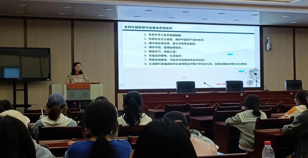资助育人工作,增强学生对国家资助政策的了解,切实做到精准资助,学院于9月19日在逸夫楼一楼报告厅开展大学生资助政策宣讲会,2022级全体本科生参与,辅导员雷小梅老师主持会议。